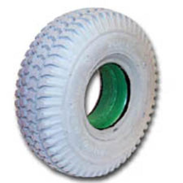 Primo Power Trax mobility tire. Tire assembly fits most 260X85, 300-4 rear power wheelchair or scooter wheels. Non-marking gray rubber.